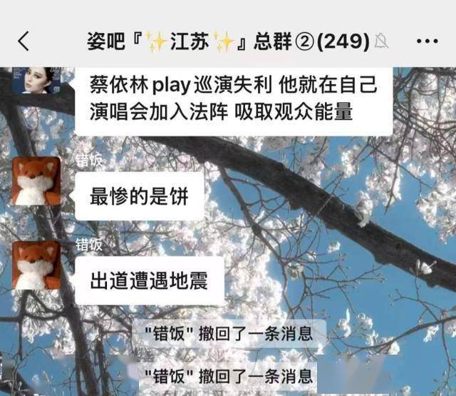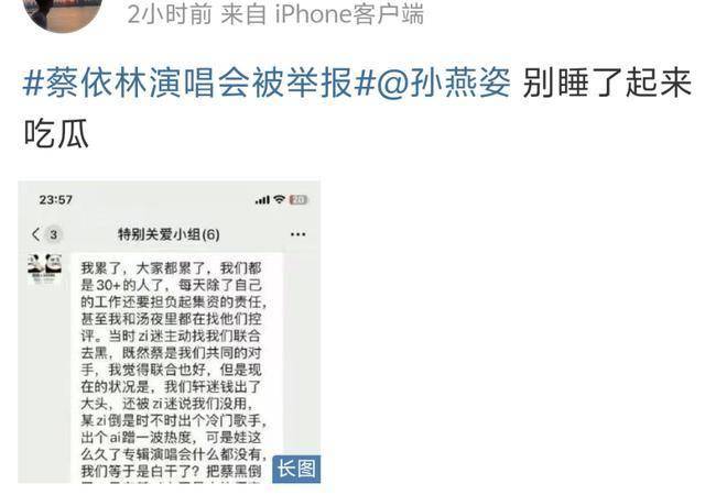 粉丝还曝光了一组疑似孙燕姿粉丝群的截图,截图显示配配查,群里有人在大张旗鼓造蔡依林的谣。